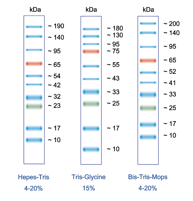 - 适用性广:适用于不同体系的凝胶中(Tris-Glycine、Bis-Tris、Hepes-Tris等),可用于SDS-PAGE时观察蛋白电泳情况,Western blot时判断蛋白转移效率,以及SDS-PAGE和Western blot时的蛋白分子量标准;
