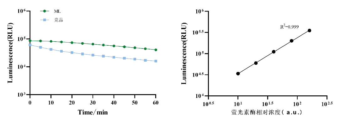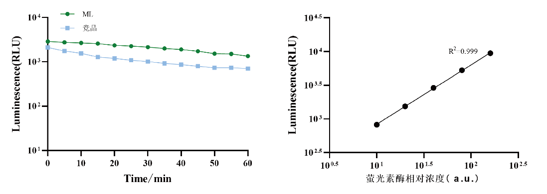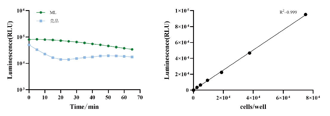 方法:细胞培养体系下验证光强稳定性及细胞密度-光强标曲。将Renilla萤光素酶载体瞬时转入293T细胞/CHO-K1细胞,24h后分别使用MA0524及竞品Renilla萤光素酶报告基因检测试剂盒检测细胞水平发光稳定性(50000个细胞/孔)及线性拟合情况。