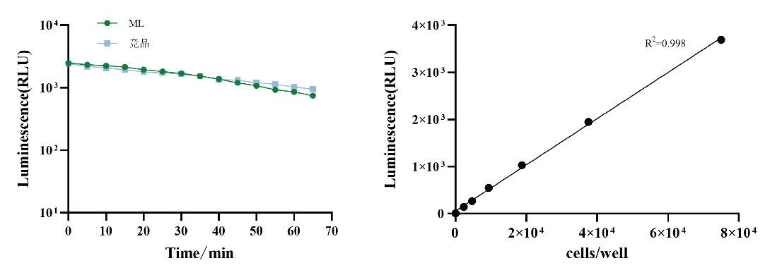 图2. CHO-K1细胞表达的Renilla萤光素酶发光稳定性及线性检测