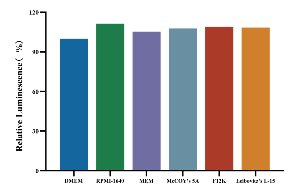 结论:本Renilla萤光素酶报告基因体系兼容多种培养基。