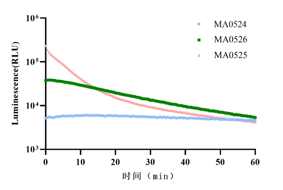 结论:产品发光亮度依次为MA0525>MA0526>MA0524。产品发光稳定性依次为MA0525<MA0526<MA0524。