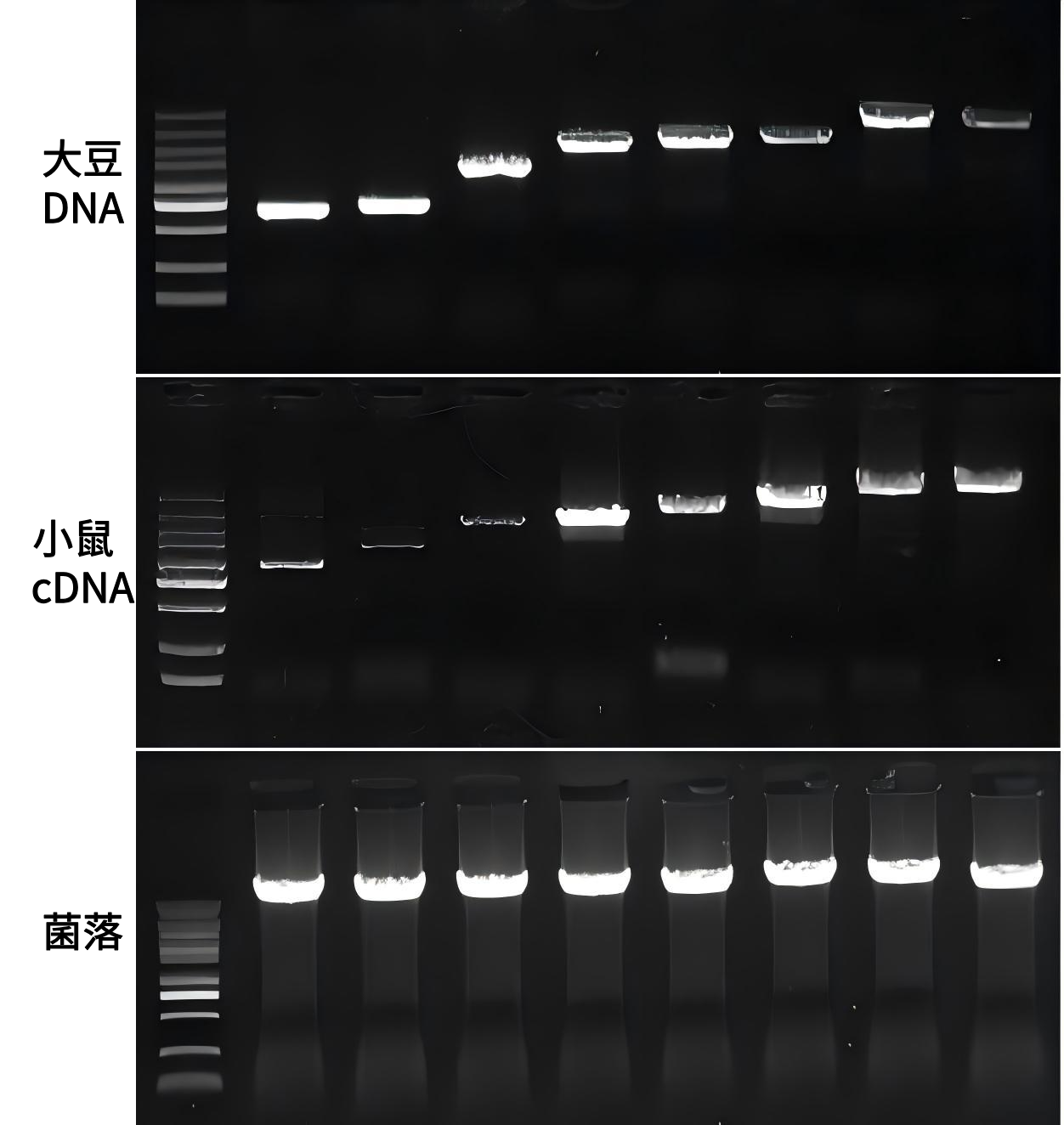方法:分别以大豆DNA、小鼠cDNA、菌落样品为模板,使用2×Taq Master Mix扩增1~5kb片段,PCR反应结束后进行核酸电泳检测。