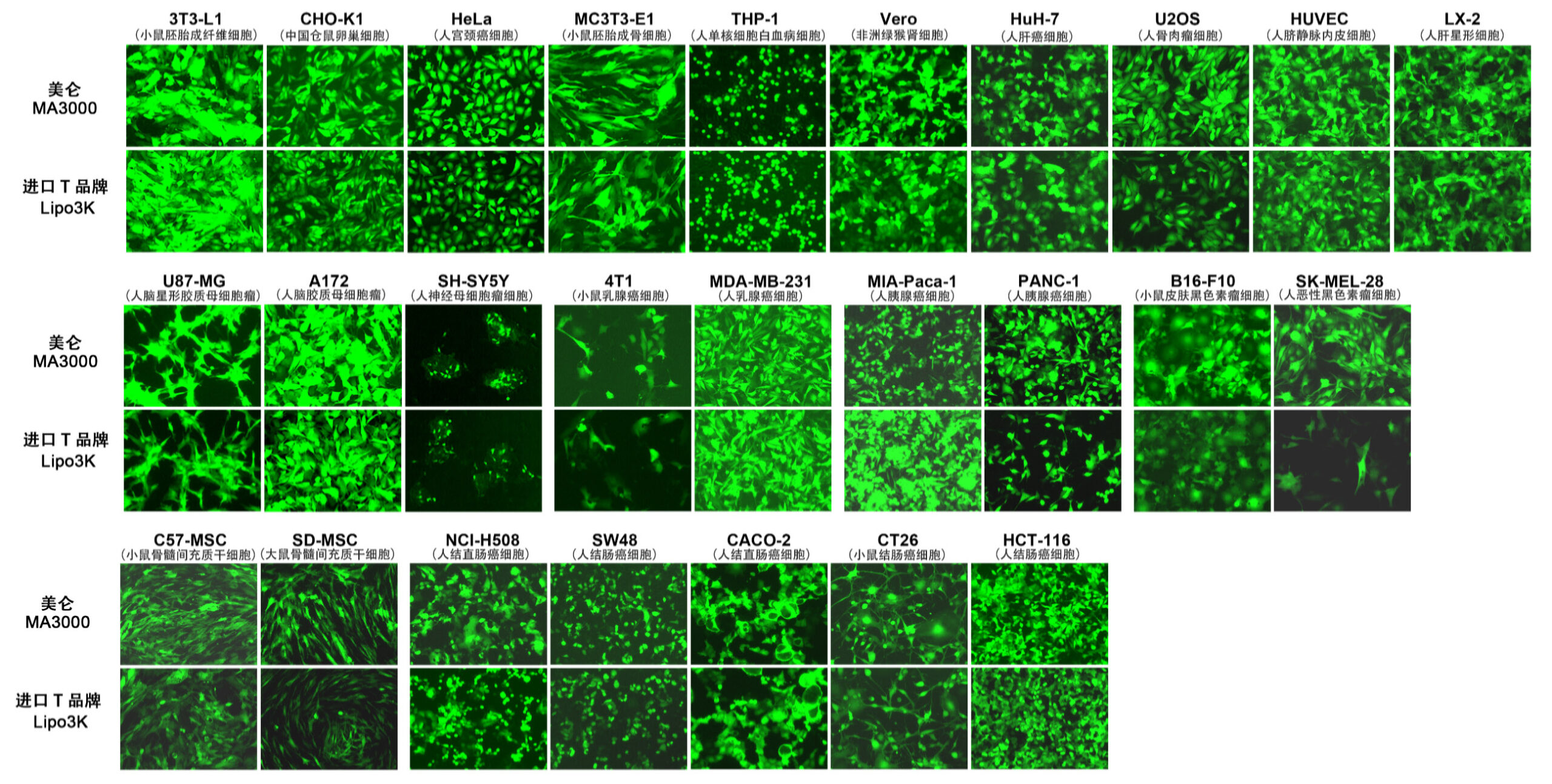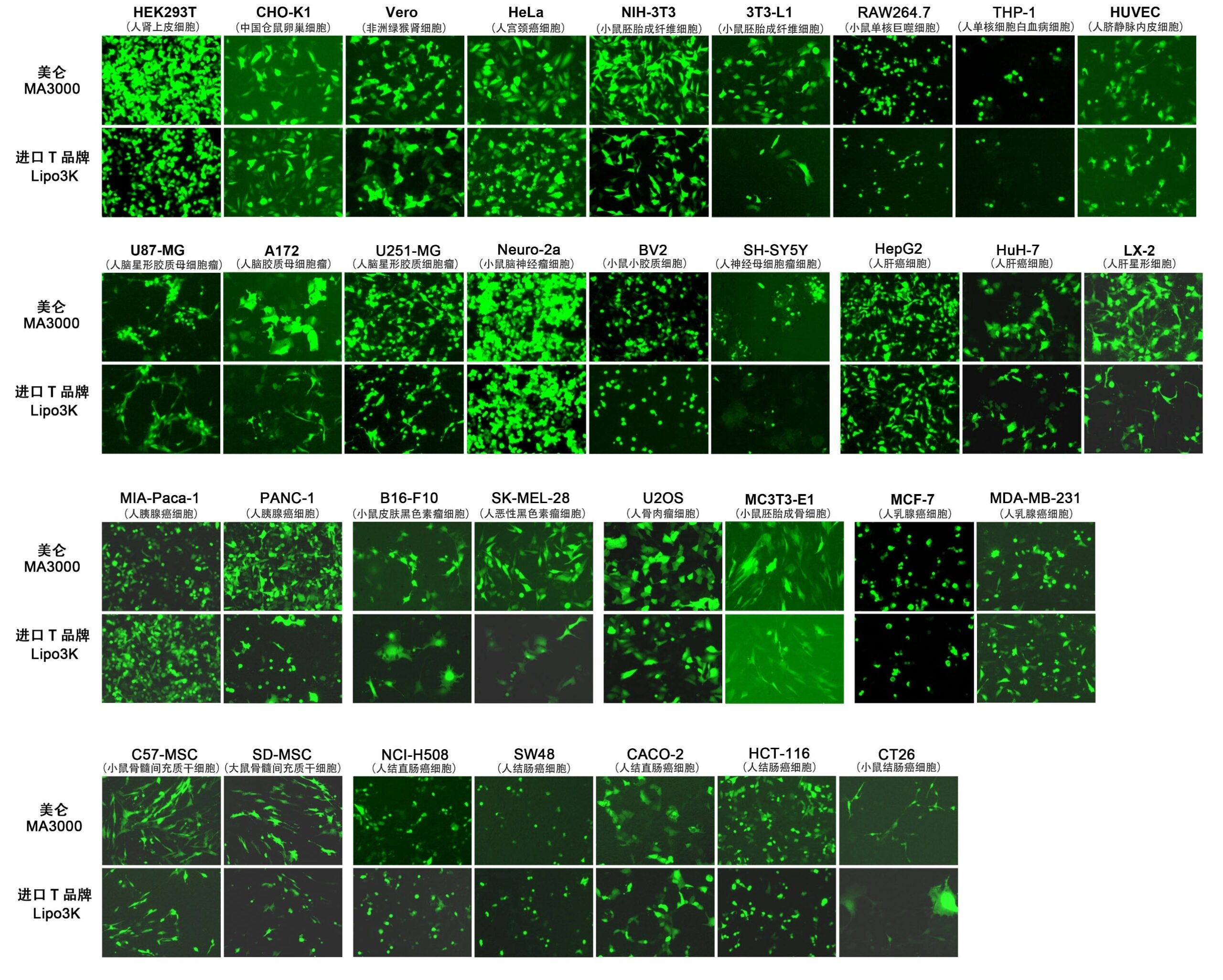 结果:在下述30余种细胞中,我司自研产品MA3000在超半数细胞中表现出优于进口对照的转染效果,可实现替代。