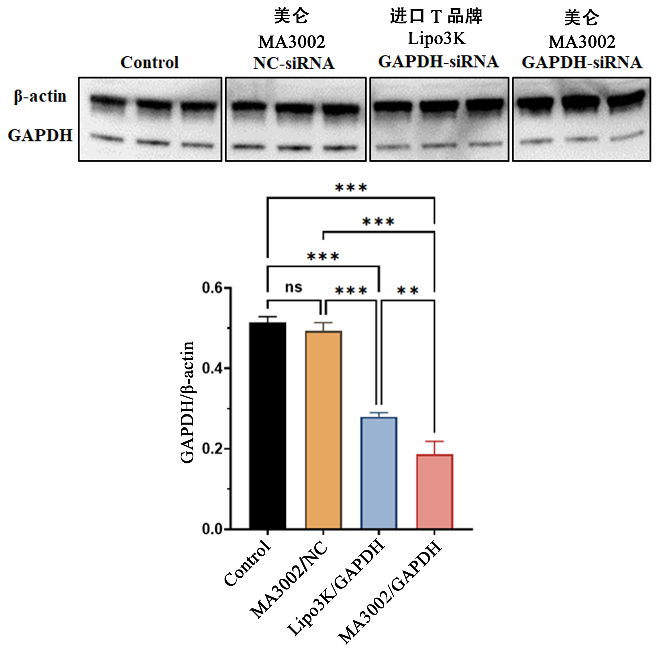 方法:分别使用我司MA3002和进口T品牌的相应产品对THP-1细胞转染GAPDH siRNA,24小时后提取蛋白、Western Blot表征目标蛋白的表达情况并进行相对内参β-actin的灰度计算,判断siRNA转染效果。