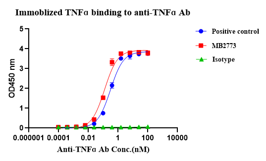 Immoblized TNFɑ (Meilunbio Cat:MA1363) at 1μg/mL binding to anti-TNFɑ antibody (Meilunbio, Cat:MB2773), and tested by Mouse Anti-Human IgG Fc Antibody [HRP] at 1:10000, The binding EC50 is 0.124 nM.