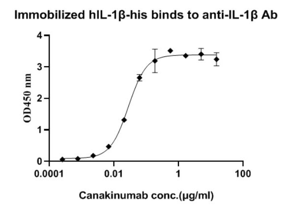Immobilized hIL-1β-his at 1μg/mL can bind to Canakinumab (Meilunbio, Cat: MC13510). The EC50 is 0.0280μg/mL.